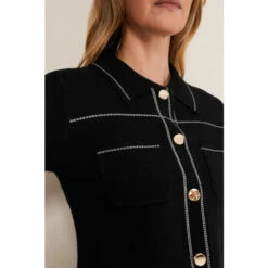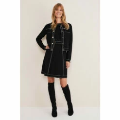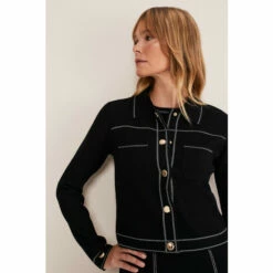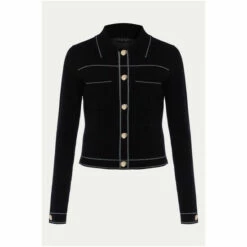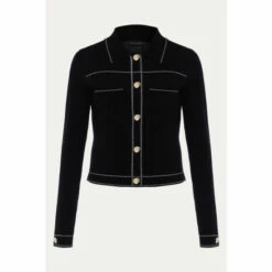 Our Amaya black jacket features statement contrast white stitching and gold button down detailing that makes this a standout style. For co-ord style, wear with our Amaya skirt.