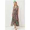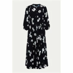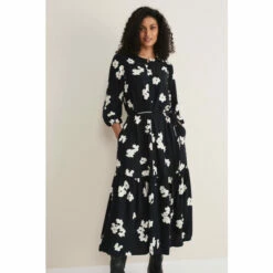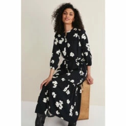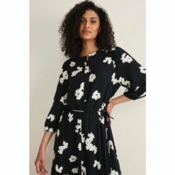 Your new go-to dress. Decorated in white, large florals, our black dress is a striking style that features a notched neckline, 3/4 blouson sleeves and a loose, flowing silhouette. We wear ours with black boots for a stylish dinner outfit.