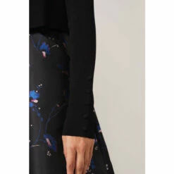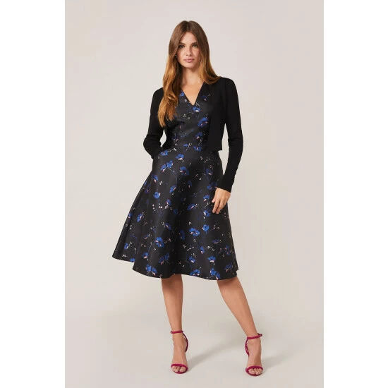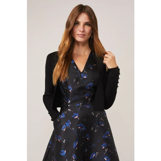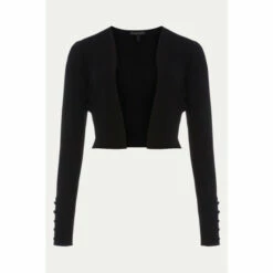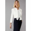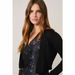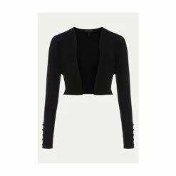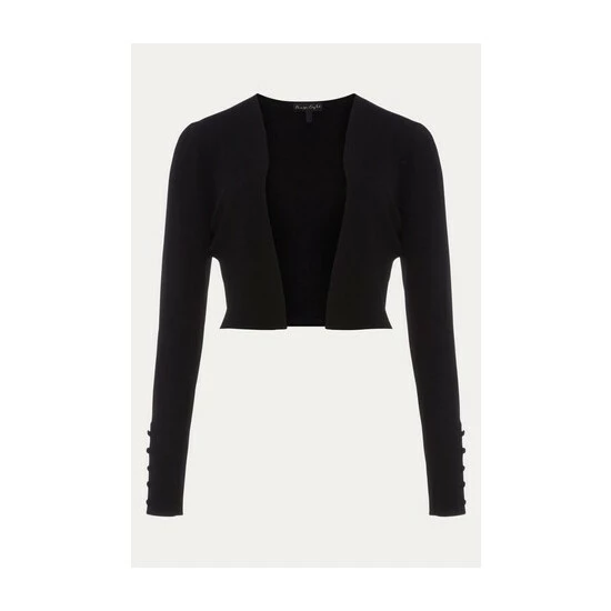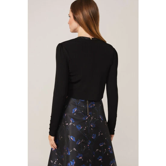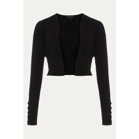 A smart structured knit jacket with an open front, soft ruching at the shoulders and long length sleeves. This cropped design is collarless and has a clean, boxy fit.