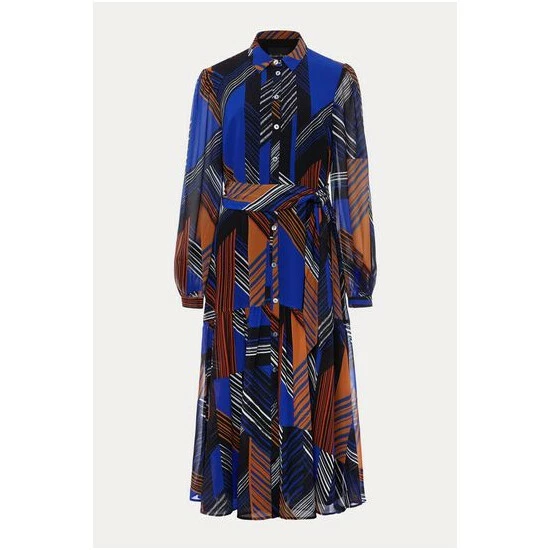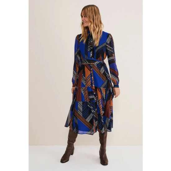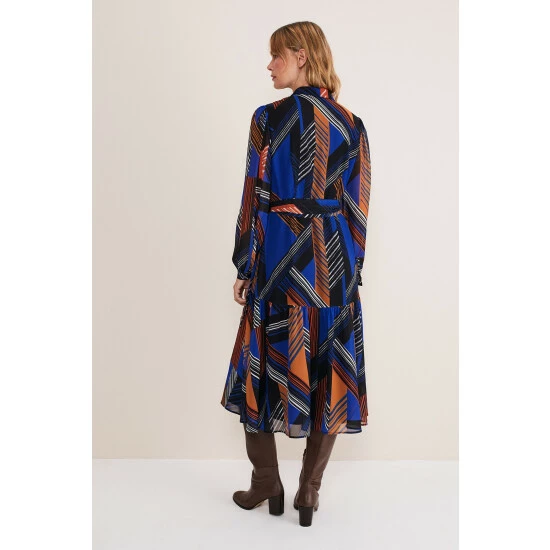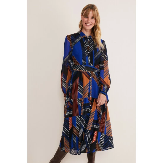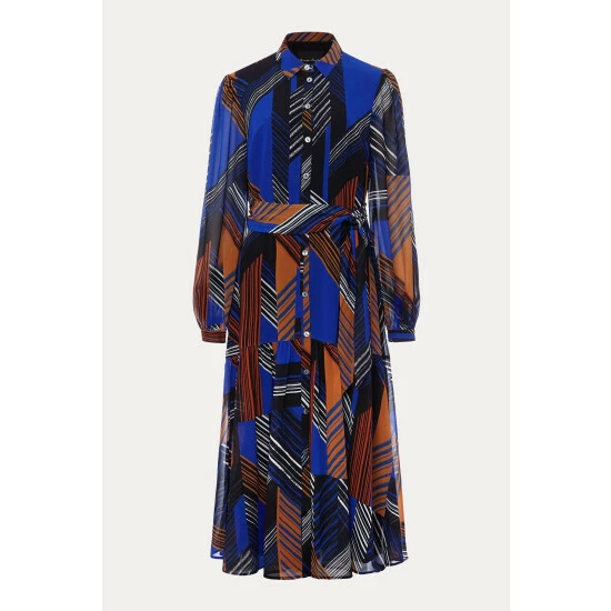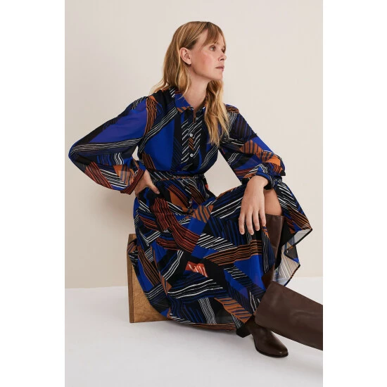 Your new work-to-weekend dress. Designed in a bold, abstract print, our shirt dress features a classic collar, and blouson sleeves and is finished with a tie waist belt. We wear ours with leather boots for a casual weekend look. This style is responsibly sourced.