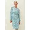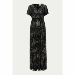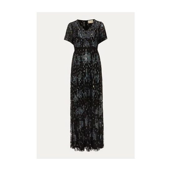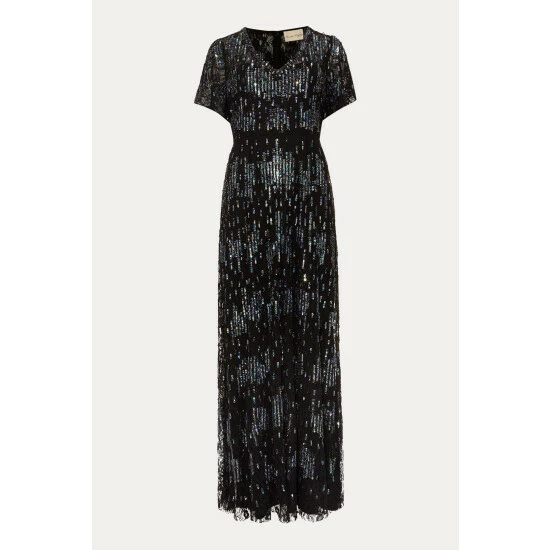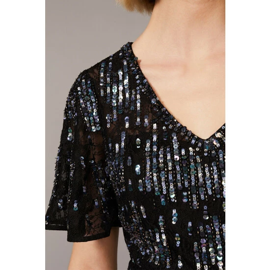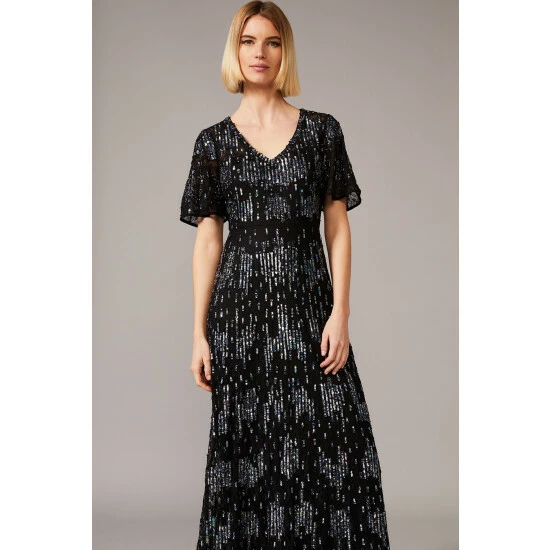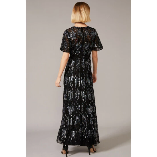 From Collection 8, Phase Eight’s stunning range of premium evening dresses. Look closely at the Clarabelle dress and you’ll see it is a floral lace dress, intricately embellished with rivulets of sequins in different shades of blue. This stunning full length style is framed with fluted sleeves , a classic V-neck, and a sheer back. Wear yours to your next black tie event.