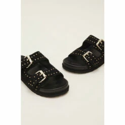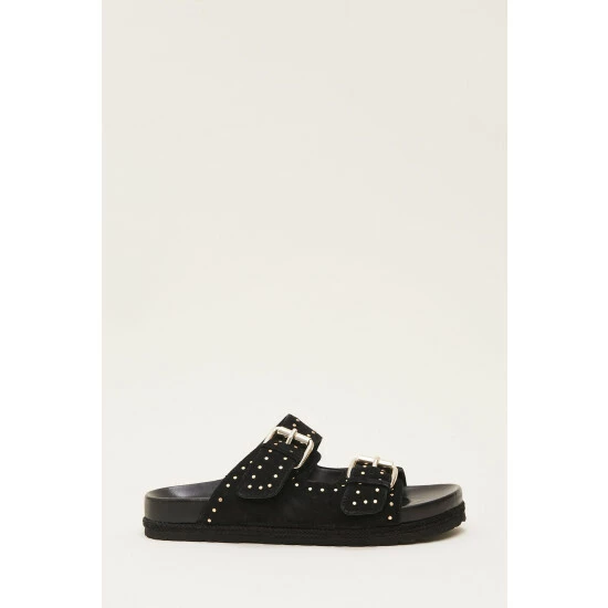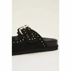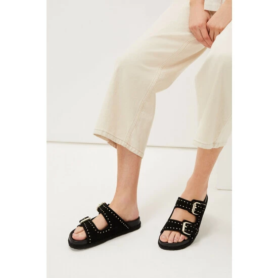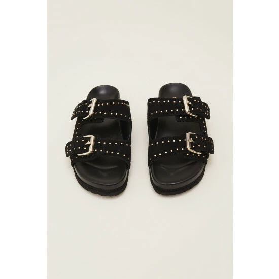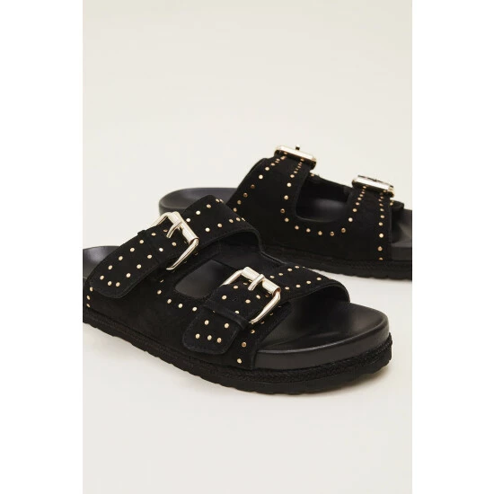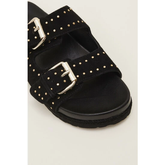 The perfect sandals to slip on and wear with all your everyday outfits. Crafted from soft, black suede and designed with a double strap and buckle, this style is finished with gold studding detail.