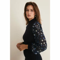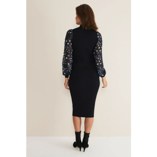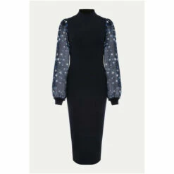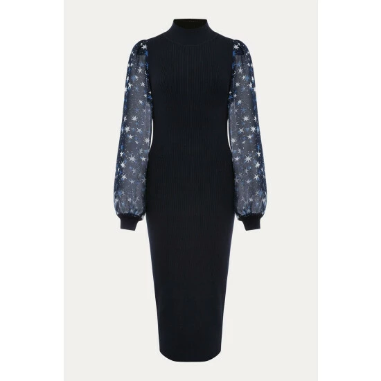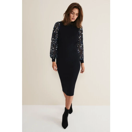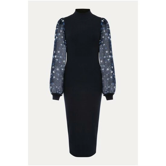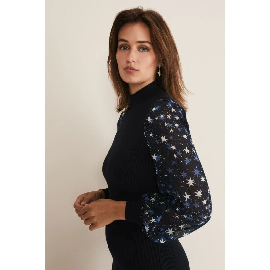 A staple dress with a contemporary twist. Our Emina knitted dress is designed with a black ribbed shift silhouette and features statement star print blouson sleeves. Dress this style up with stiletto boots or down with chunky ankle boots. This style is responsibly sourced. This style is responsibly sourced. This style has been made from recycled polyester giving materials that would have ended up in landfill a new lease of life.