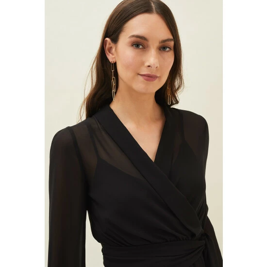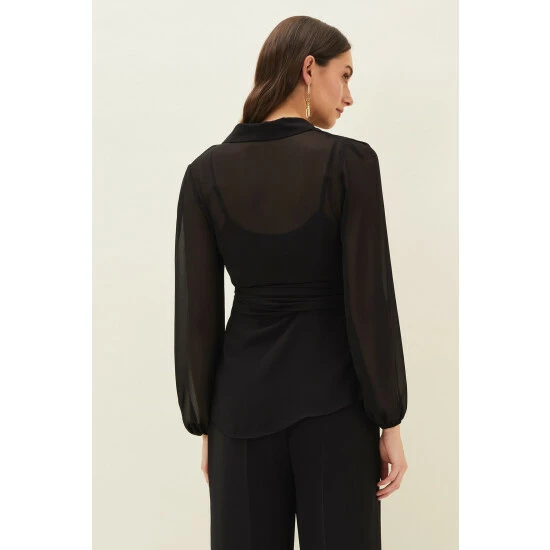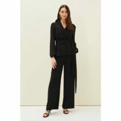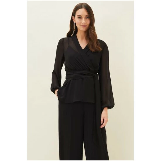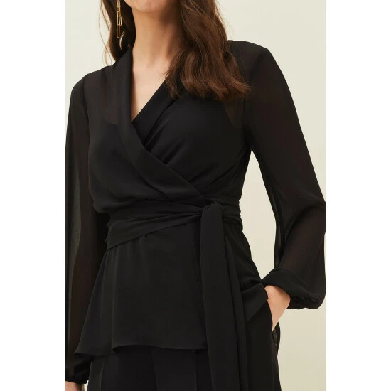 For a more contemporary take on occasion dressing, look no further than our Florentine co-ord. Designed in a classic black shade, this matching set features this semi-sheer wrap top with long blouson sleeves and oversized waist tie. Style with the Florentine Trousers for an effortlessly elegant look.