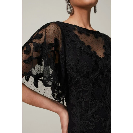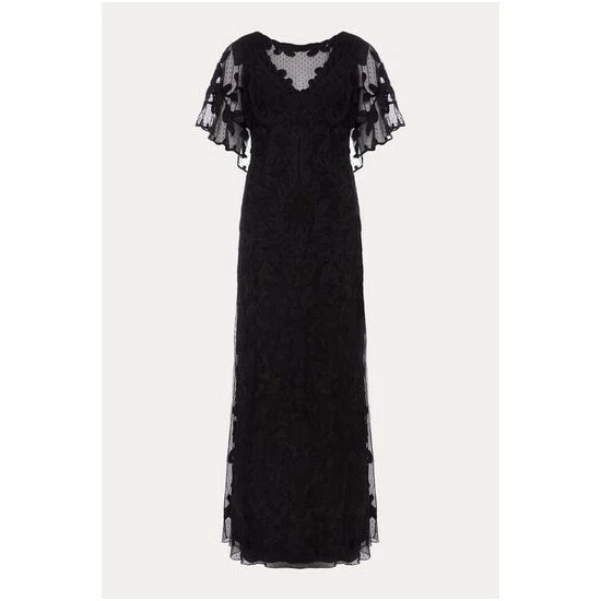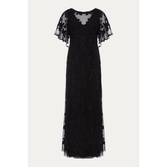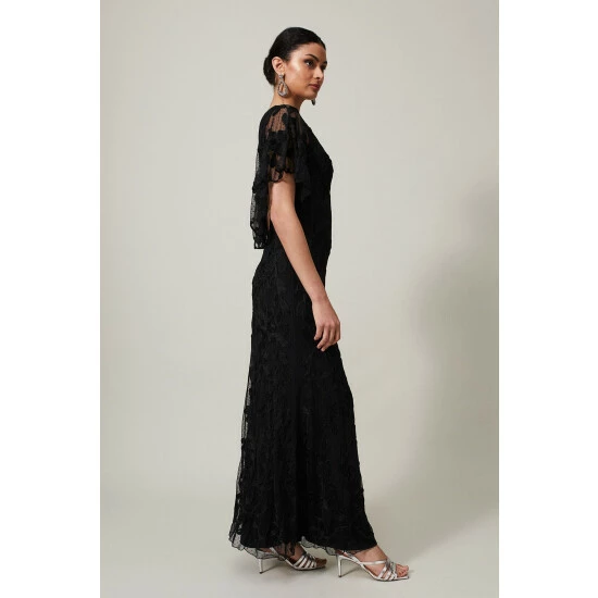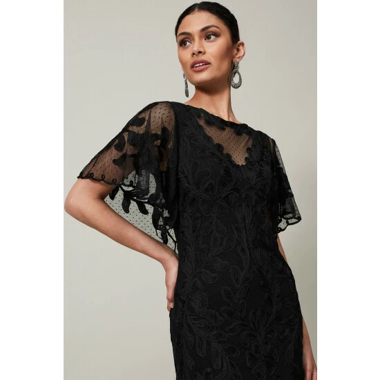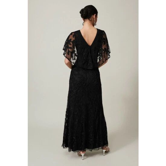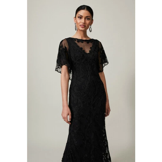 Part of Collection 8, our range of premium evening dresses. This is a show stopping style for your next special event. Designed with our signature handsewn tapework lace detail throughout, our flattering slim fit dress features a semi-sheer overlay that comes to wide sleeves and falls to a flowing silhouette. There s no doubt that you ll look stunning in our Noelle dress.