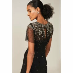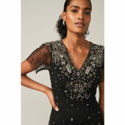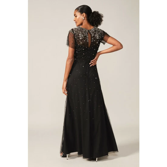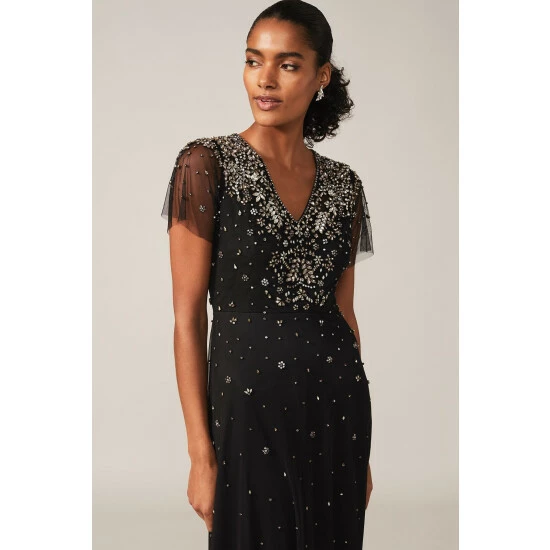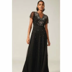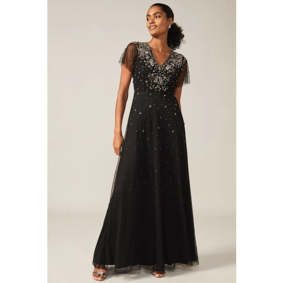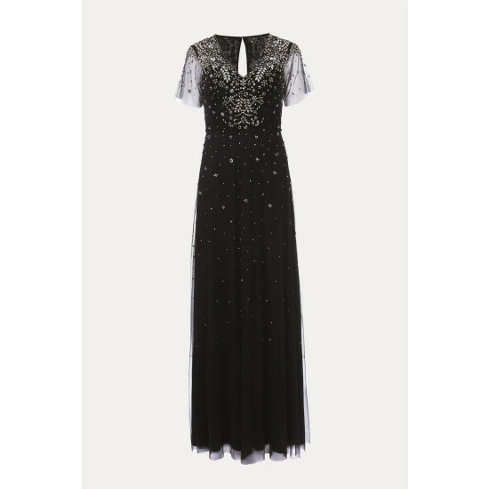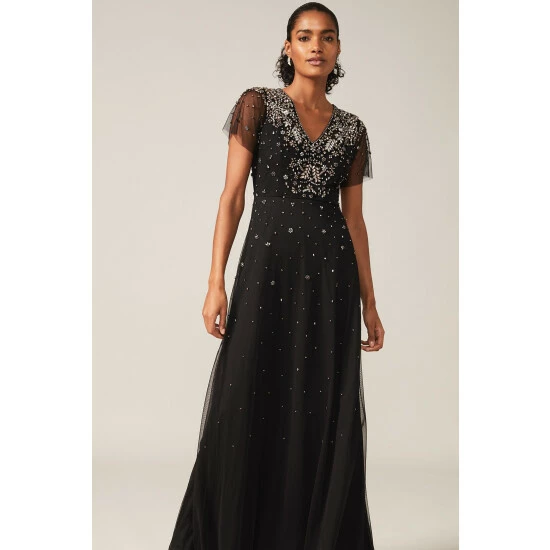 From Collection 8, Phase Eight’s stunning range of premium evening dresses. Infused with ethereal romance, the Pascale dress is adorned with pretty floral embellishment and crafted with a layer of sheer tulle that falls through the full-length skirt, creating beautiful volume. This style is an ideal choice for black tie events or prom season. Accessorise with light-catching earrings and a box clutch to complete your occasion look.