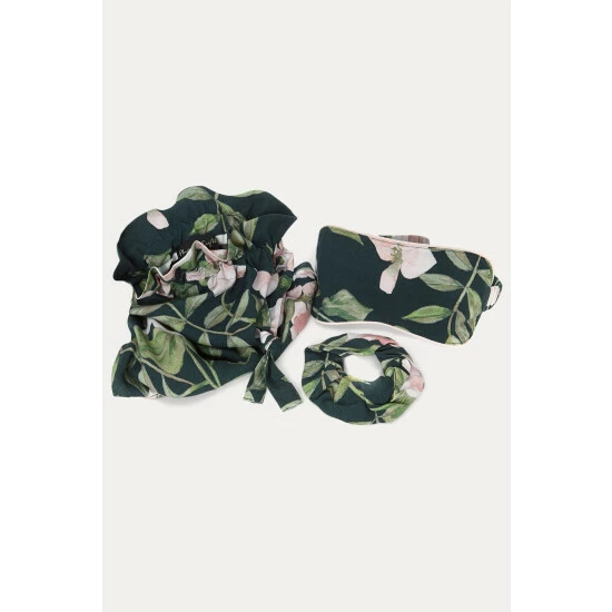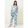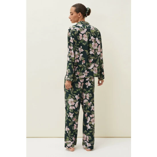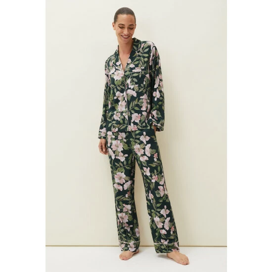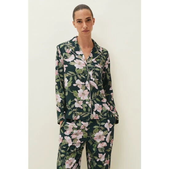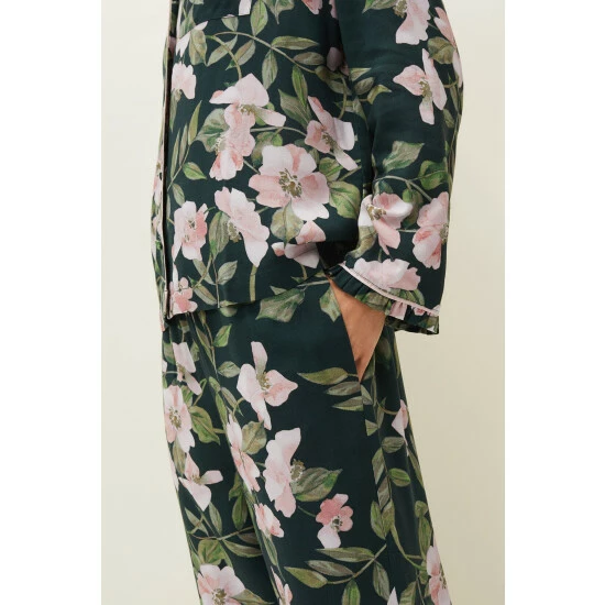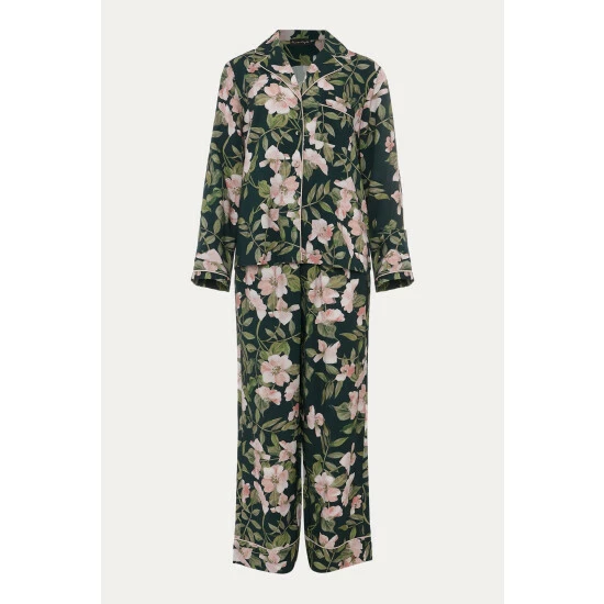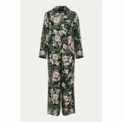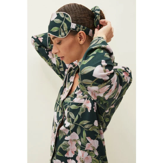 Our Pina pyjama set is designed with a floral print that’s so beautiful you’ll want to wear it beyond the house. Featuring a shirt and wide leg trousers, accented with feminine piping and handy pockets. Coordinate with the matching Pina robe. All of our pyjama styles come with a matching eye-mask and scrunchie in a self-tie bag. || Model wears UK Size 10 and is 5’9″/180cm
