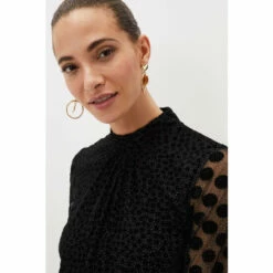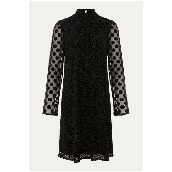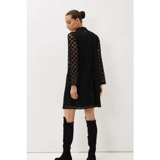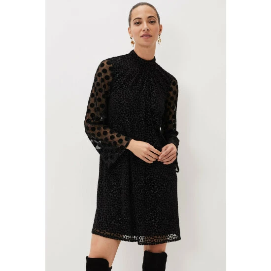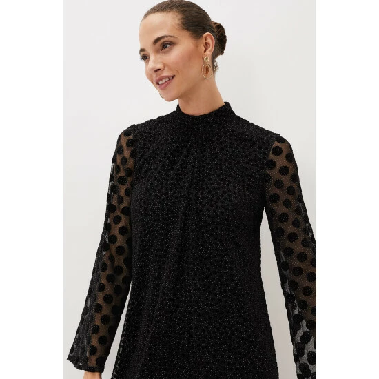Meet this season’s LBD update. The Sevina tunic dress is designed with a mixed spot print texture that is both modern and eye-catching. Framed by semi-sheer fluted sleeves, they’re wearing theirs with knee high suede boots for a simple yet stylish evening look.