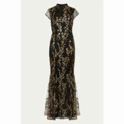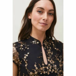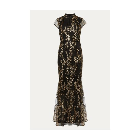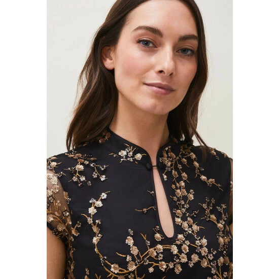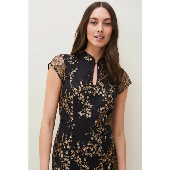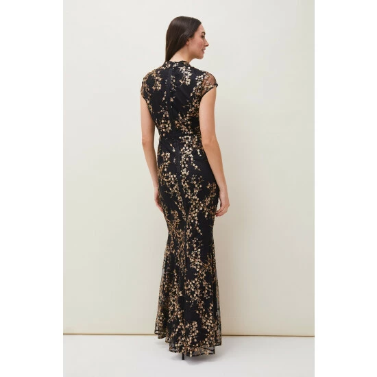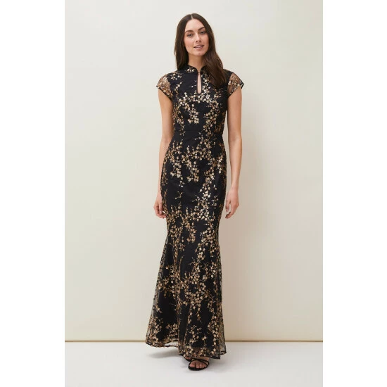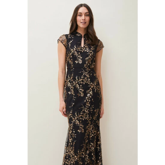 From Collection 8, Phase Eight’s stunning range of premium evening dresses. Embroidered with trailing sequin blossoms, this elegant floor length evening dress is a true show-stopper. Cut in a fitted, feminine silhouette that fishtails out in a flare, Sia is finished with a mandarin collar that fastens with demure covered buttons; sheer cap sleeves and keyhole detail that adds a touch of modernity to this classic style.