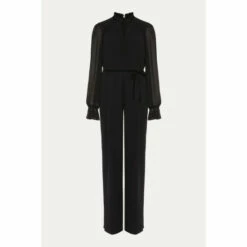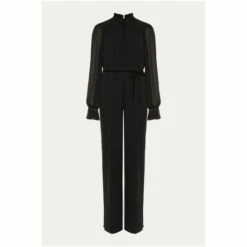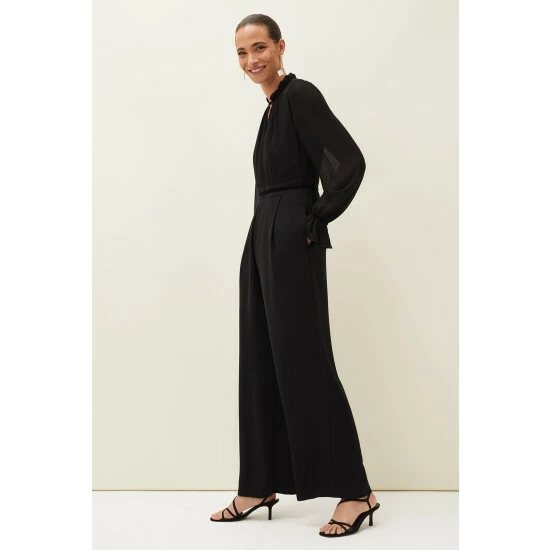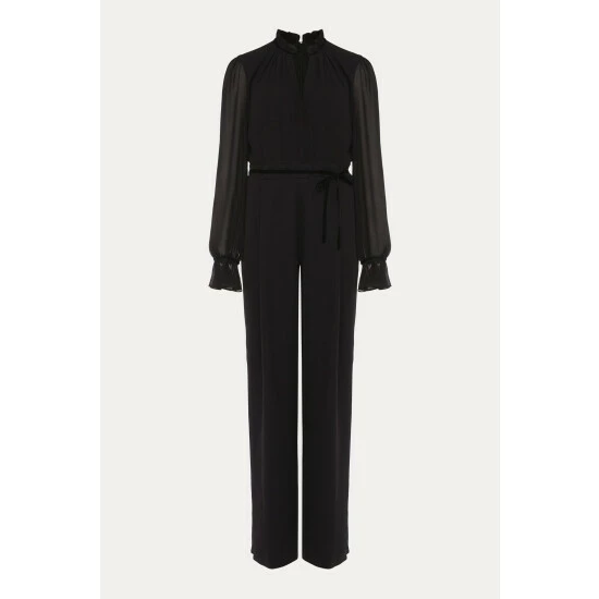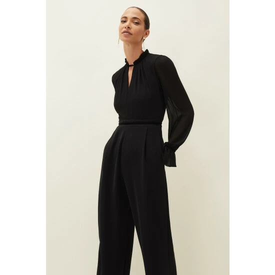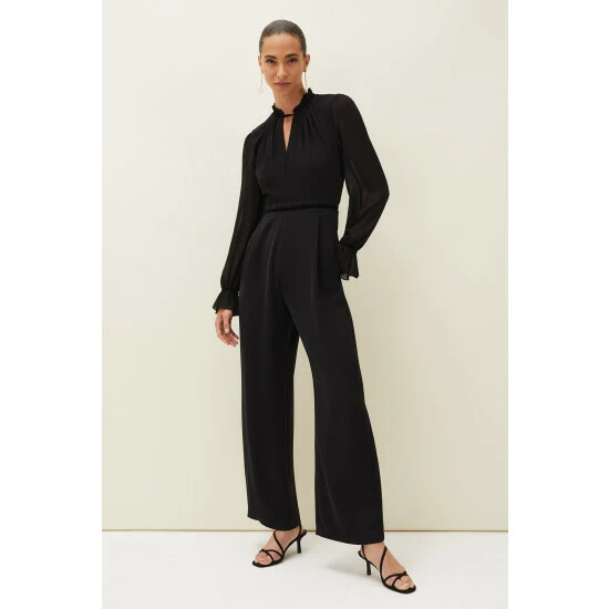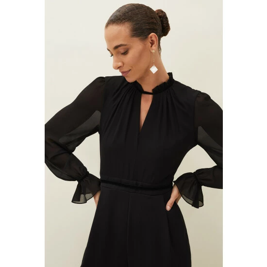 A style made for occasions, this wide leg jumpsuit has velvet trims, semi-sheer blouson sleeves with frilled cuffs and ruched bodice finished with a cut-out detail.