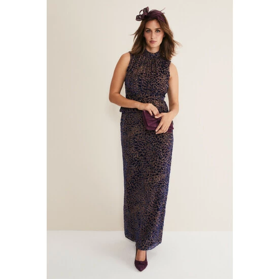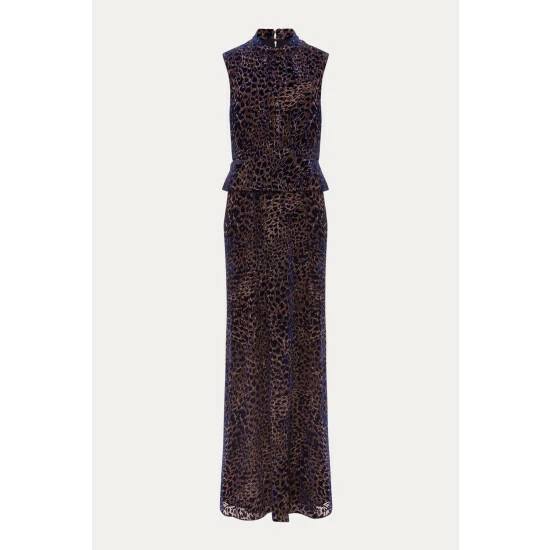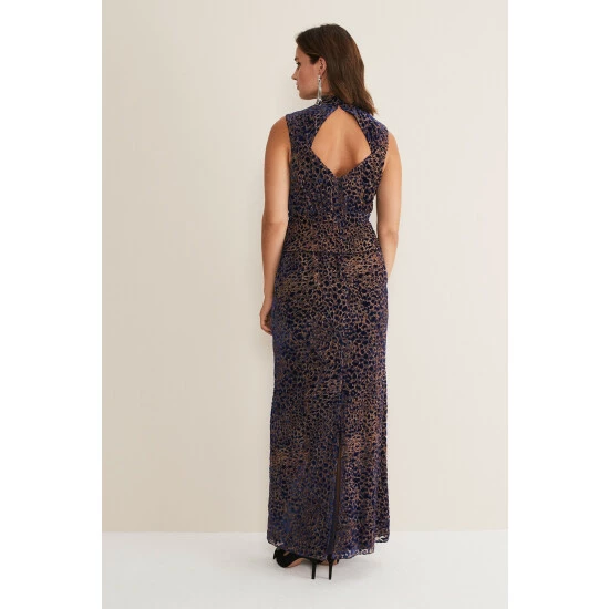 A contemporary style to wear to your next occasion. Designed in a statement velvet animal print, our Catalina sleeveless dress features a high neck and statement open-back detailing. The flowing silhouette falls to a floor-sweeping length. We wear ours with heels and a matching clutch for a perfect event-ready look.