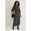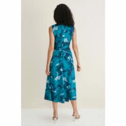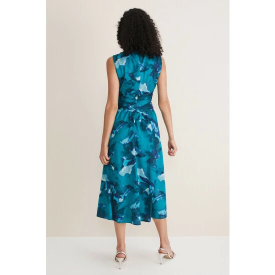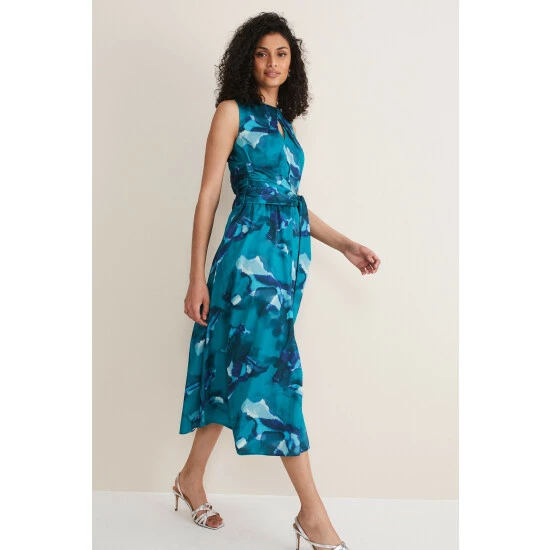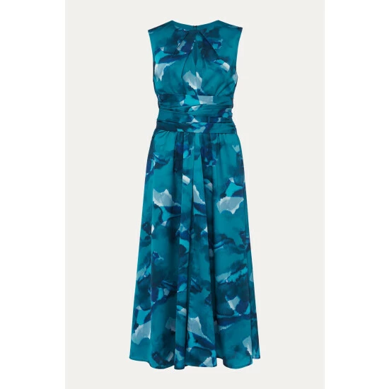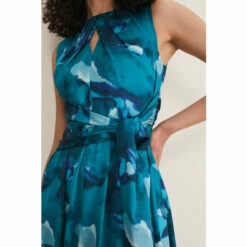 A statement style for your next event. Designed with a beautiful abstract print, our sleeveless dress features a slim fit bodice wth pleated and keyhole detailing at the neckline that comes to a tie tie belt and falls to a flowing, loose skirt silhouette. Style with heels for a statement look. This style is responsibly sourced. This style has been made from recycled polyester, giving materials that would have ended up in landfill a new lease of life.