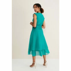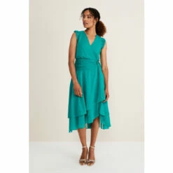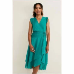 A modern silhouette that will look fabulous at any occasion. Our Cressinda dress is designed with a wrap bodice, frill sleeve and draped waist detailing and falls to a floating silhouette with a tiered, asymmetric skirt. This simple, stunning style will work at all of your upcoming occasions. This style is responsibly sourced. This style has been made from recycled polyester, giving materials that would have ended up in landfill a new lease of life.