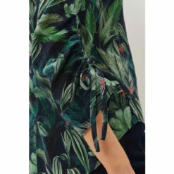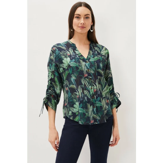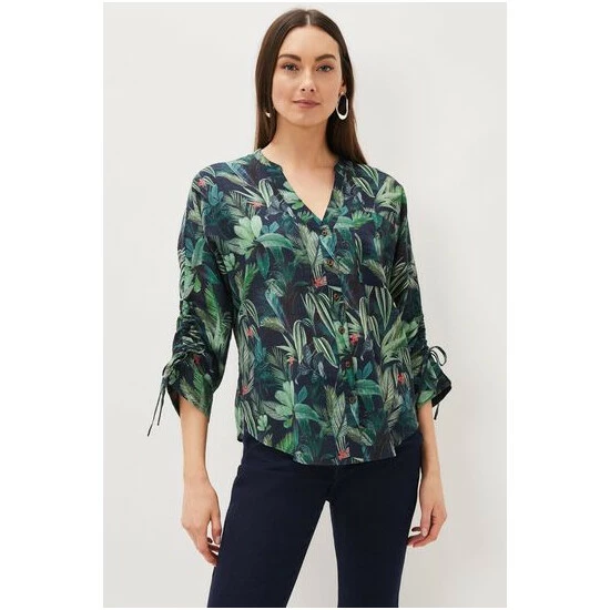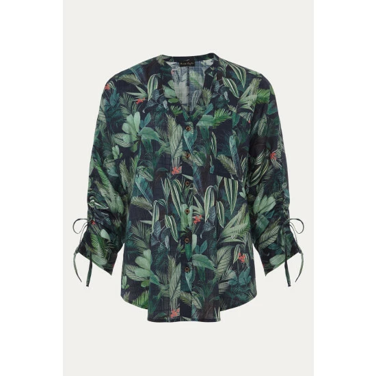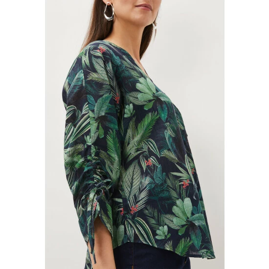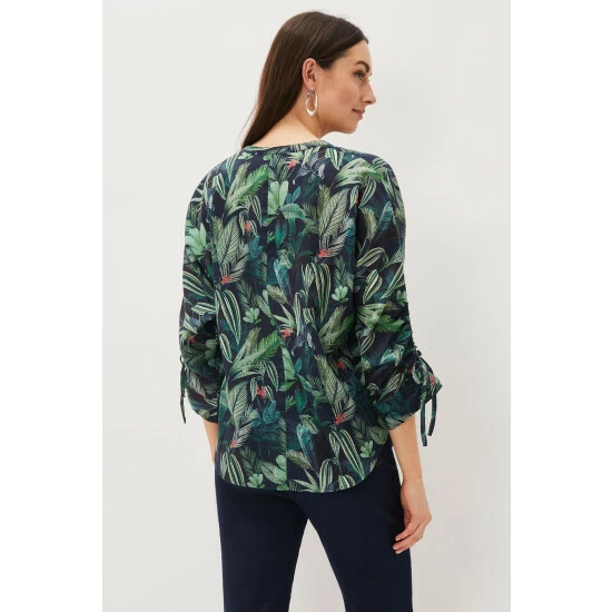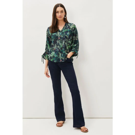 A must-have style for your new season wardrobe. Our blouse is cut from 100% comfortable cotton and designed in a contemporary, on-trend palm print. This style is finished with a feminine V-neckline, working buttons and adjustable drawstring details on the sleeves. We’ll be wearing this with all of our trousers and jeans.