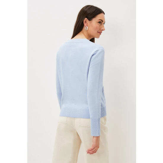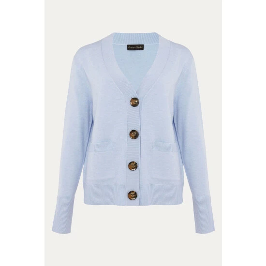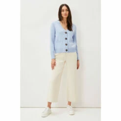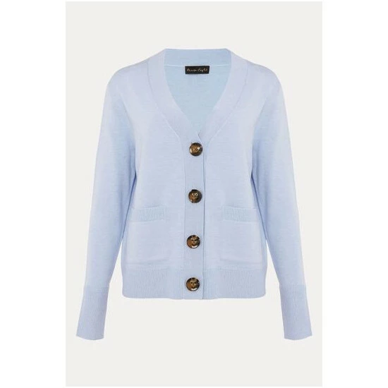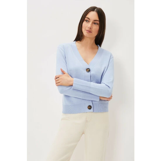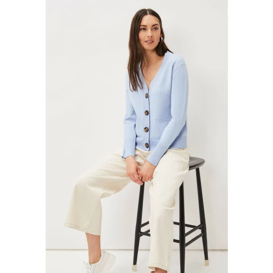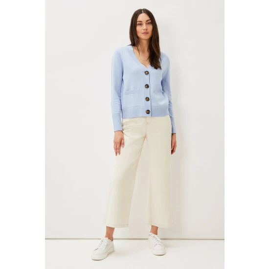Every capsule wardrobe needs a versatile fine knit cardigan, and our Ima style ticks all the boxes. Designed in a boxy silhouette, with a V-neck, contrast button fastenings and pockets. We wear pure with ecru wide leg jeans for a casual weekend look.