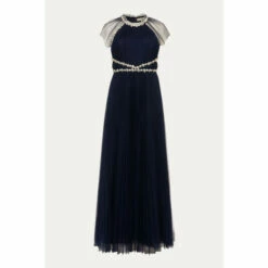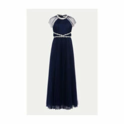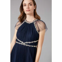 A gorgeous style that would make a perfect bridesmaid dress or prom style, this full-length design has been created in softly pleated tulle for a romantic finish, and detailed with eye-catching embellishment around the waist, sleeves and high ruffled neckline.