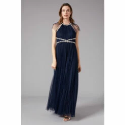 A gorgeous style that would make a perfect bridesmaid dress or prom style, this full-length design has been created in softly pleated tulle for a romantic finish, and detailed with eye-catching embellishment around the waist, sleeves and high ruffled neckline.