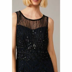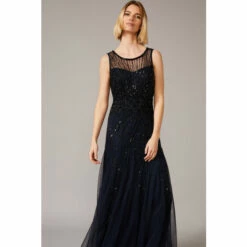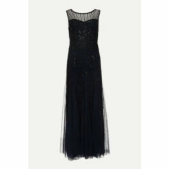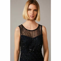 From Collection 8, Phase Eight’s stunning range of premium evening dresses. This stunning 1920s-inspired style features a sheer beaded neckline and intricate sequin embellishment throughout. The godets in the skirt create a voluminous effect and wonderful movement as you walk. Perfect for your next black tie event.