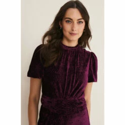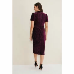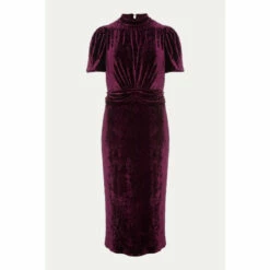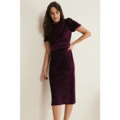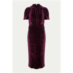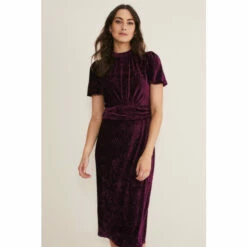 Every wardrobe needs a velvet dress: meet yours. Designed in a deep burgundy shade to a slim fit silhouette, our Kaylee dress features a round neck, short sleeves and pleated detailing along the bodice to the waist belt. It falls to a versatile midi length that looks perfect paired with heels ready for a special occasion.