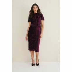 Every wardrobe needs a velvet dress: meet yours. Designed in a deep burgundy shade to a slim fit silhouette, our Kaylee dress features a round neck, short sleeves and pleated detailing along the bodice to the waist belt. It falls to a versatile midi length that looks perfect paired with heels ready for a special occasion.