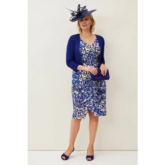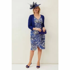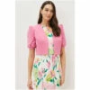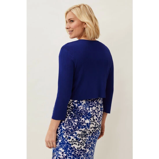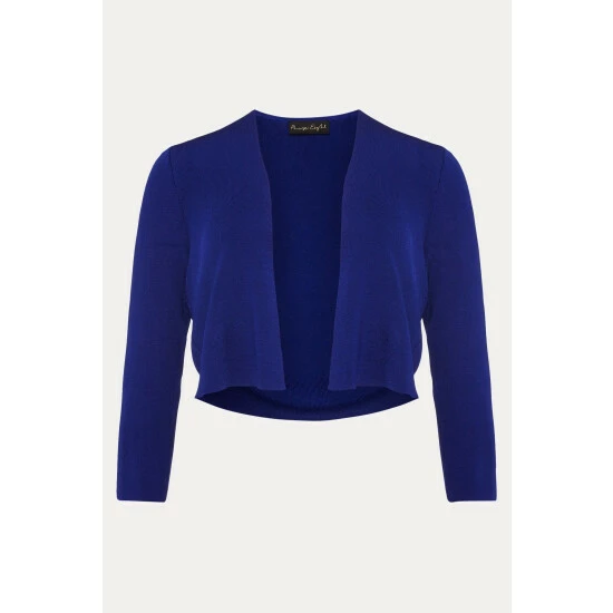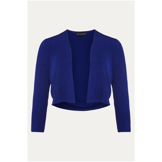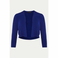 A smart structured jacket with an open front, pleats at the shoulder and 3/4 length sleeves. This cropped design is collarless and has a clean, boxy fit.