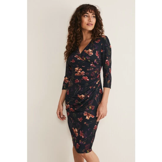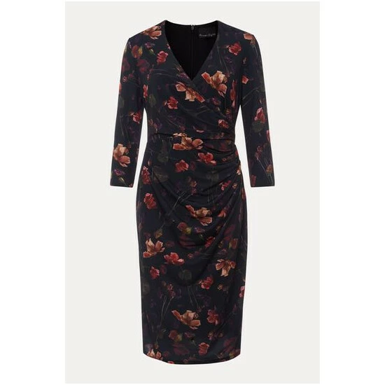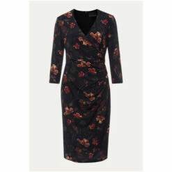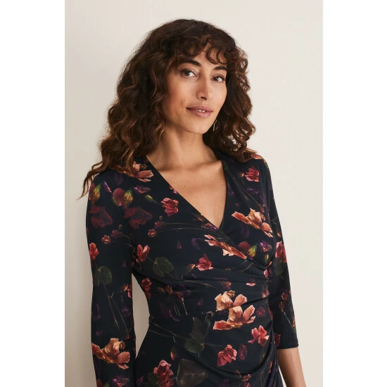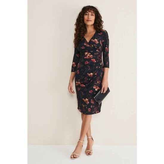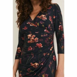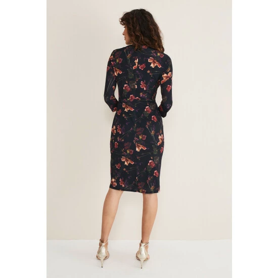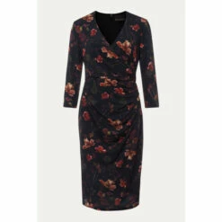 A striking style you’ll reach for again and again. In a stunning dark floral design, our Lottia dress features a slim fit silhouette with a wrap bodice silhouette and elegant draped detailing along the waist. They wear ours with gold heels but it would look equally as gorgeous with tights and boots.