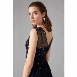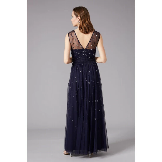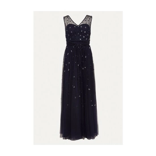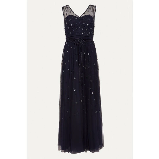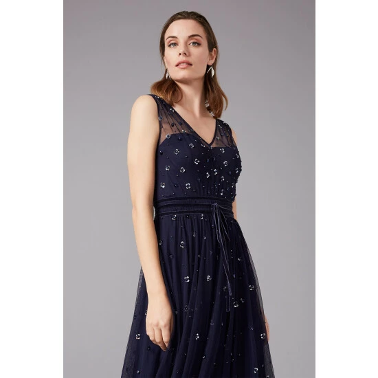 Perfect for black tie events, proms and bridesmaid style, this romantic dress features a full-length, semi-sheer tulle overlay framing a sweetheart bodice and is embellished with 3D floral embellishment. A waistband made of contrasting velvet ribbons helps to define the waist, and can be tied as you wish.