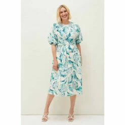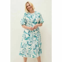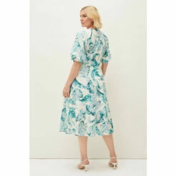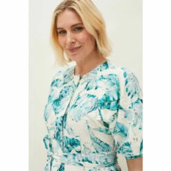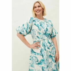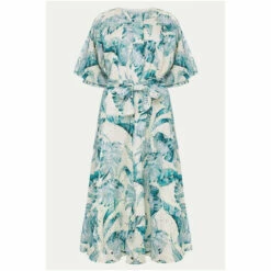 The perfect dress for sun-soaked occasions and much-anticipated getaways. Designed with a striking palm print throughout, this effortless silhouette guarantees style and comfort all-day long. Framed by short fluttering sleeves and a waist tie to add definition to your figure.