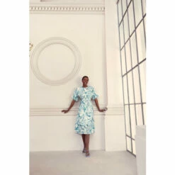 The perfect dress for sun-soaked occasions and much-anticipated getaways. Designed with a striking palm print throughout, this effortless silhouette guarantees style and comfort all-day long. Framed by short fluttering sleeves and a waist tie to add definition to your figure.