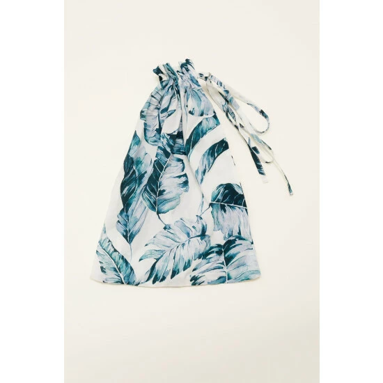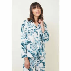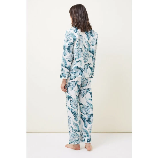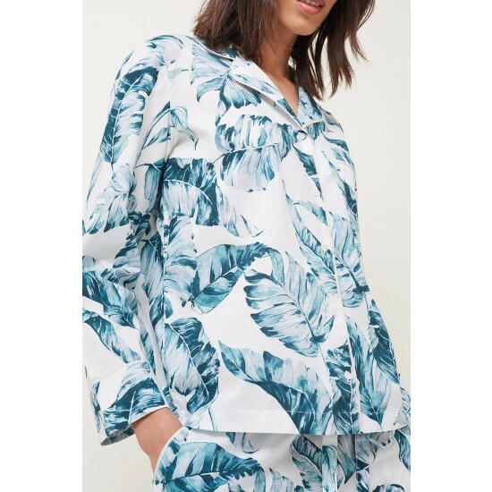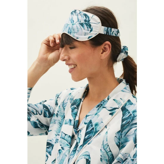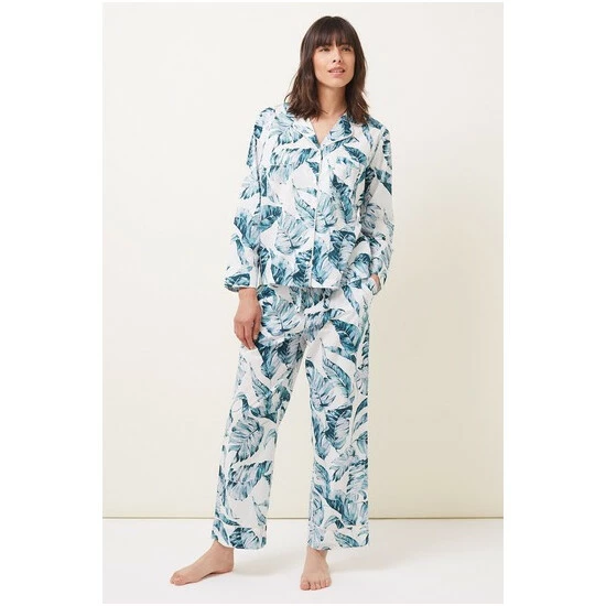 Our 100% cotton Piera pyjama set features a long sleeved button through shirt and relaxed wide leg trouser with a dreamy hand-painted palm print that is designed in-house. All of our pyjama styles come with a matching eye-mask and scrunchie in a self-tie bag. Available up to size 26. || Model wears UK Size 10 and is 5’10″/180cm