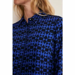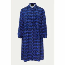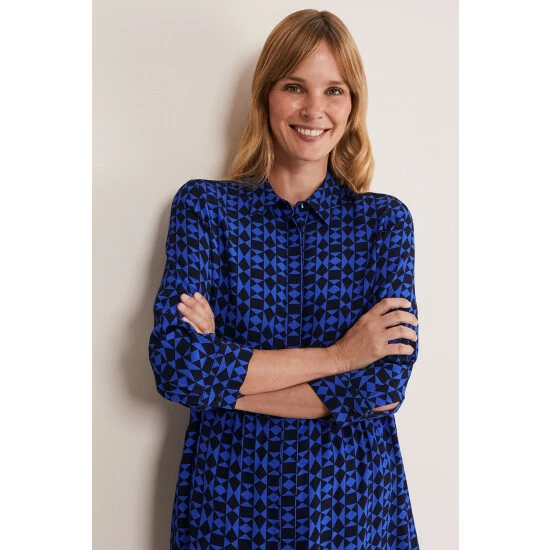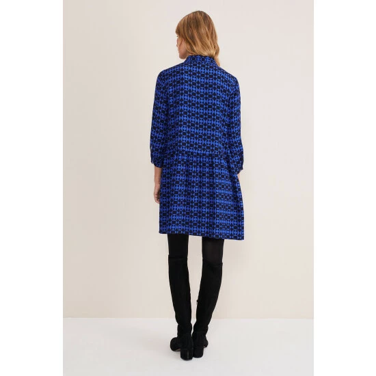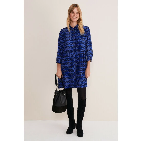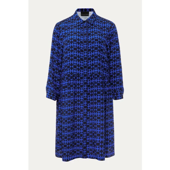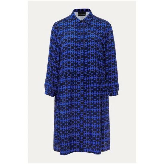 Your new do-it-all swing dress. Designed in a bold cobalt geometric pattern, our Bregitta dress features 3/4th length sleeves, a classic collar, handy pockets and a stylish swing silhouette. We wear ours with tights and knee high boots.
