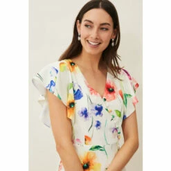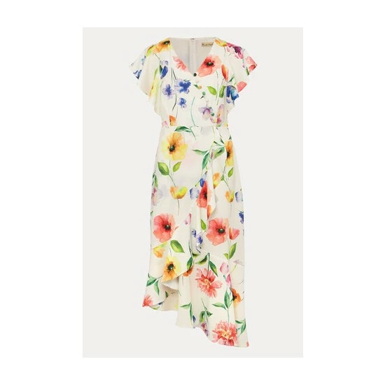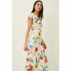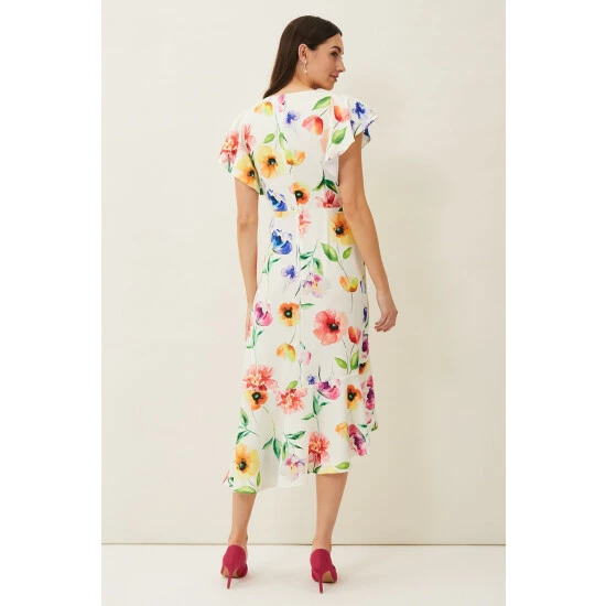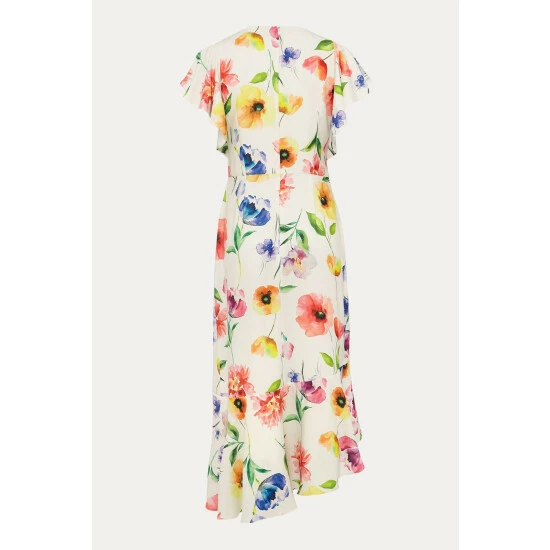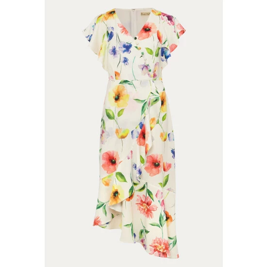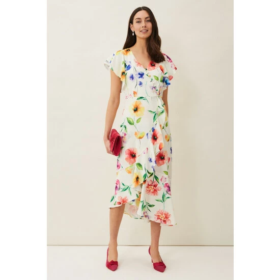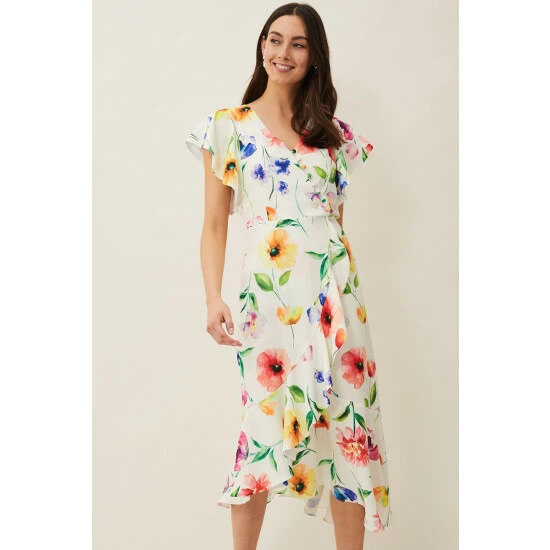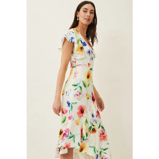 Florals, frill detailing and an asymmetric midi skirt: This occasion dress has it all. A relaxed take on event dressing that will see you through every date in your diary.