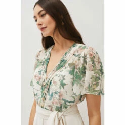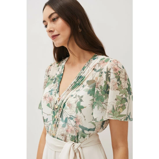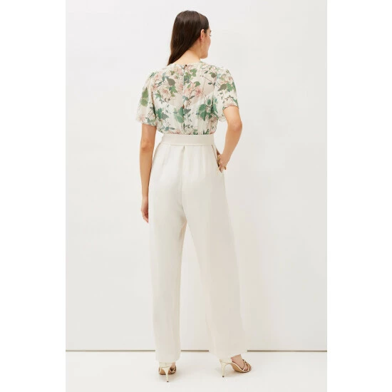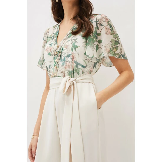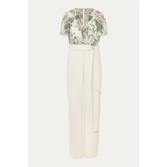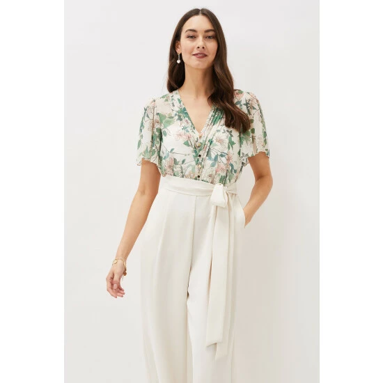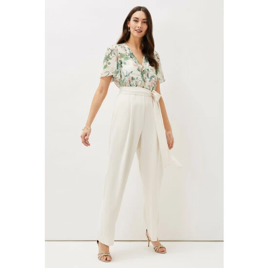 Effortlessly elegant, our Dani Jumpsuit showcases a beautiful floral print on the bodice and falls into a wide leg silhouette that creates wonderful movement as you walk. A matching fabric waist tie finishes this stunning occasion look. Perfect for wedding guest or a modern Mother of the Bride/Groom style.
