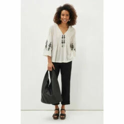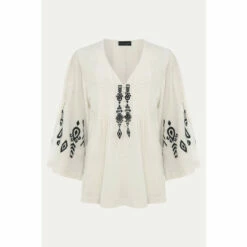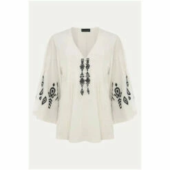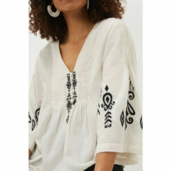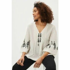 The perfect spring/summer blouse to add to your wardrobe. Designed in comfortable 100% cotton, the Eleonora blouse features Ikat embroidery and pleated detailing. This style features a V-neckline and loose sleeves that makes this style so easy to wear.
