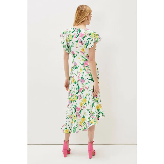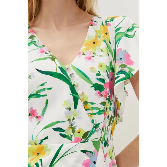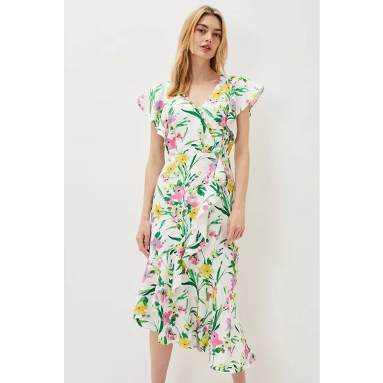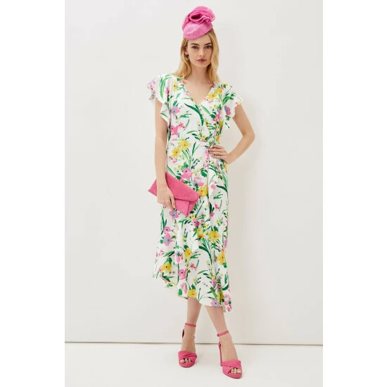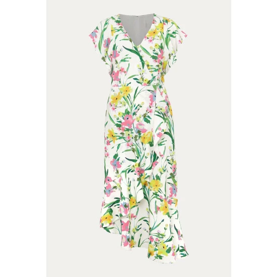 Featuring a beautiful floral print, our Evelin dress is a beautiful style to wear to all your upcoming occasions. Designed with a faux wrap bodice with covered button detailing, frill sleeves and a frill hem. We’ll be wearing this to weddings and garden parties.