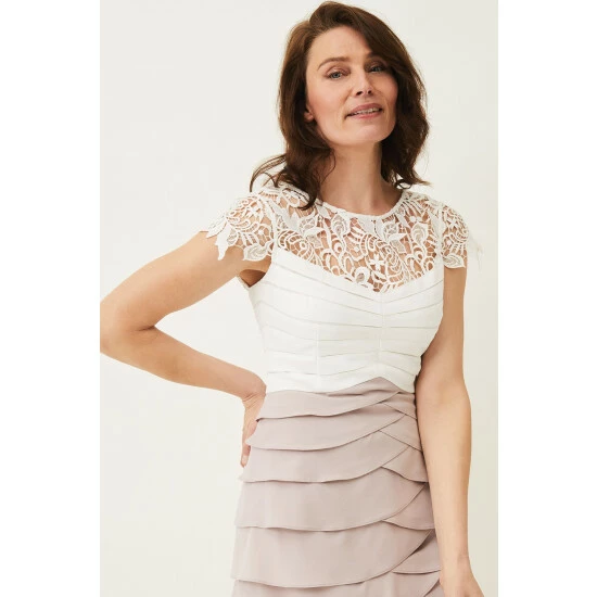 With delicate lace and layering from the bodice to the skirt, this occasion style perfect for your most important invitations.