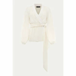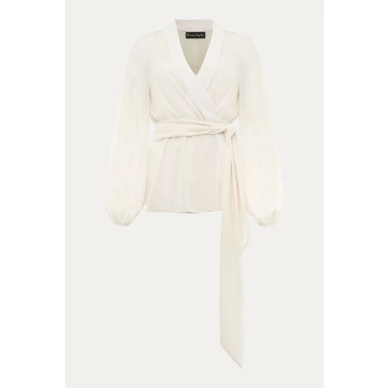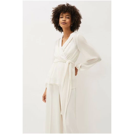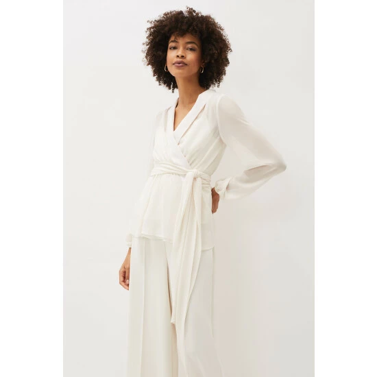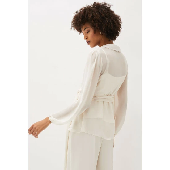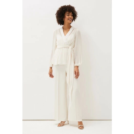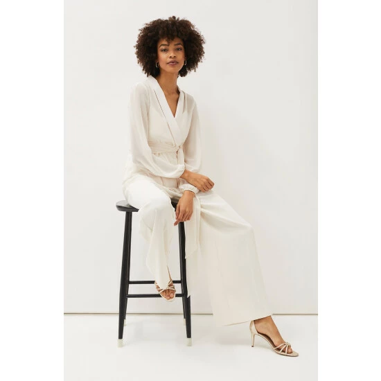For a more contemporary take on occasion dressing, look no further than their Florentine co-ord. Designed in a soft buttermilk shade, this matching set features this semi-sheer wrap top with long blouson sleeves and oversized waist tie. Style with the Florentine Trousers for an effortlessly elegant look.