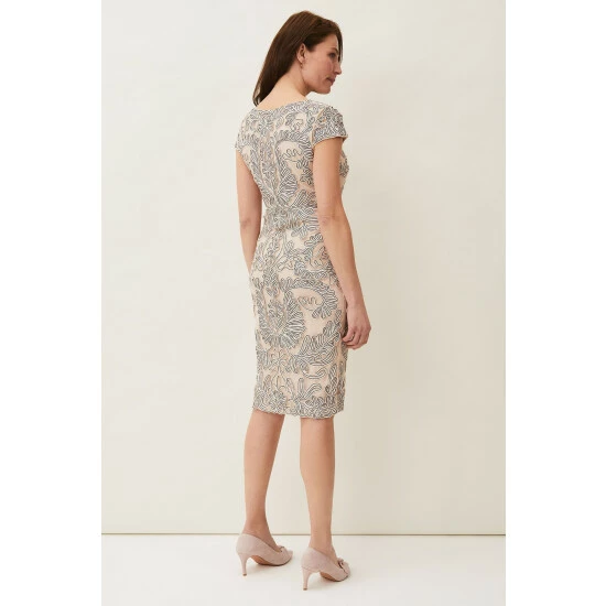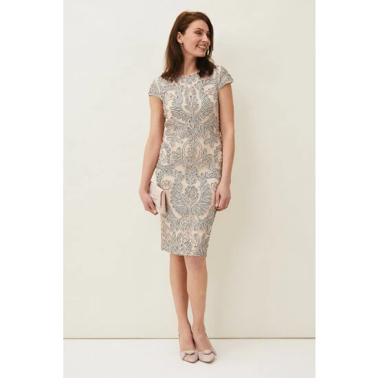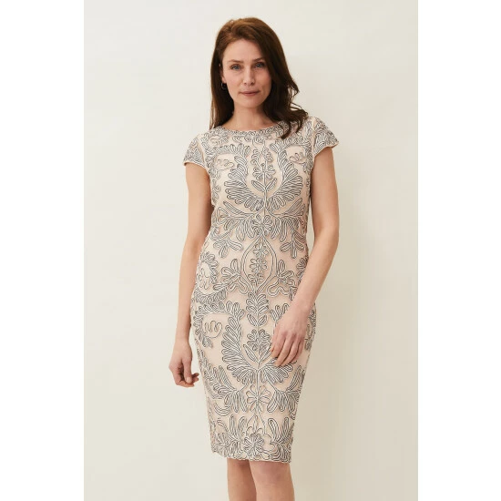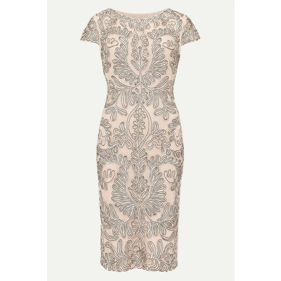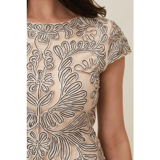 This fitted style features the signature tapework detailing throughout, in contrasting colours. With extra detailing at the round neckline and on the semi-sheer short sleeves, this intricate design is the ideal choice for parties and special occasions.