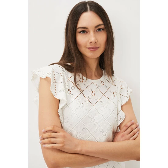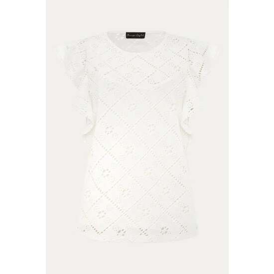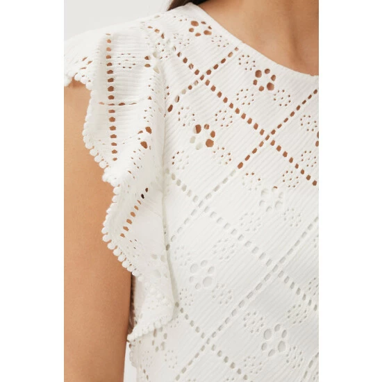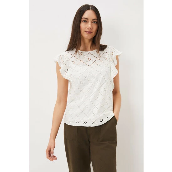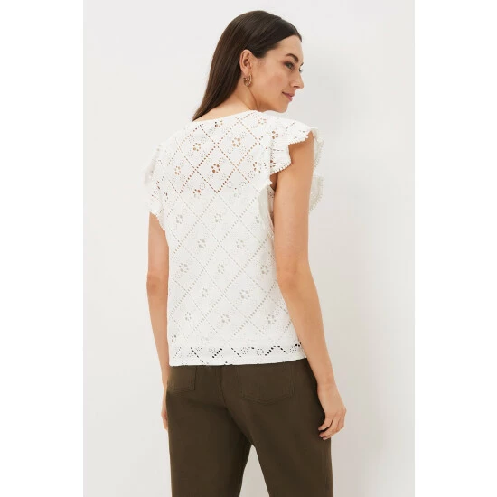 A feminine take on the classic white top. Designed with broderie anglaise and with feminine frill detailing along the short sleeves. Style with trousers and sandals for a casual, everyday look.