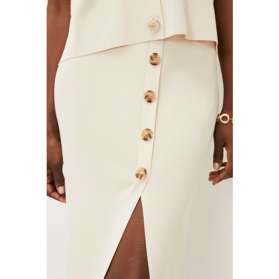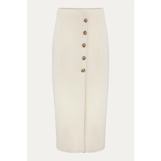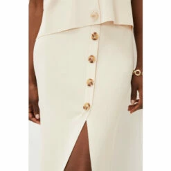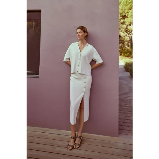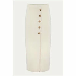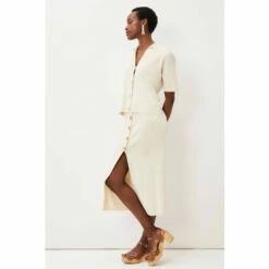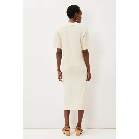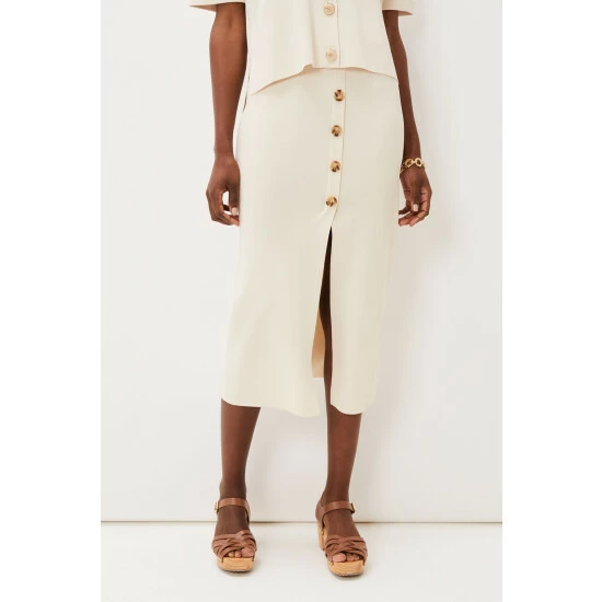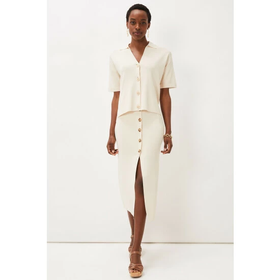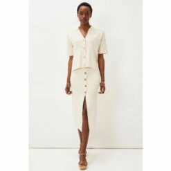 The perfect transitional piece to add to your spring/summer wardrobe. Phase Eight’s mae button up knit skirt flatteringly hugs your figure while revealing a modest split at the front, making it a versatile piece. For co-ord style, wear with their mae button up T-shirt.