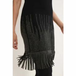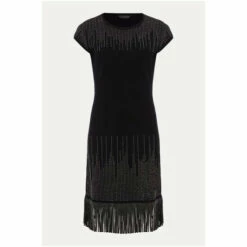 A little black dress with a fringe twist. Our Florie dress is designed to a slim fit silhouette with short sleeves and embellished detailing along the neck and to the lower hem of the skirt which is also decorated with fringe detailing. We wear ours with tights and boots for an evening-ready look. This style is responsibly sourced. This style has been made from certified renewable wood sources. LENZING™ ECOVERO™ viscose uses a responsible production process, generating up to 50% lower emissions and water impact than generic viscose. LENZING™ ECOVERO™ are trademarks of Lenzing AG.