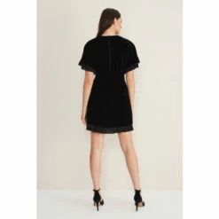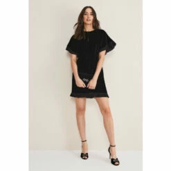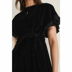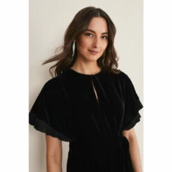 A dress you’ll keep reaching for time and time again. Designed in black our versatile velvet dress features keyhole front detailing and fluted sleeves with tassel edging at both the sleeves and hem. We wear ours with matching black heels and silver accessories.