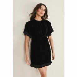 A dress you’ll keep reaching for time and time again. Designed in black our versatile velvet dress features keyhole front detailing and fluted sleeves with tassel edging at both the sleeves and hem. We wear ours with matching black heels and silver accessories.