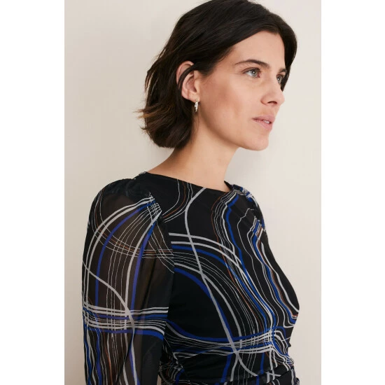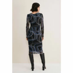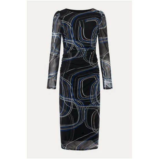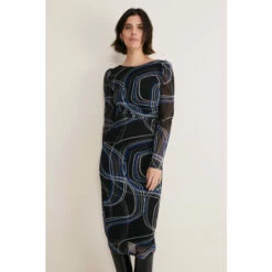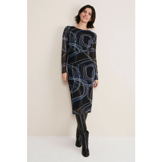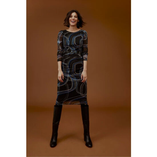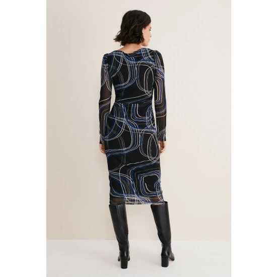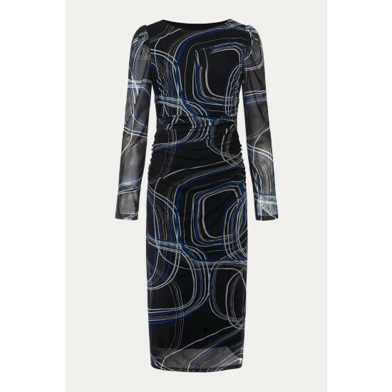 A new, contemporary style for us. Designed with semi sheer mesh detailing, our dress features an abstract swirling pattern. Style with knee-high boots for the perfect evening look. This style is responsibly sourced. This style has been made from recycled polyester, giving materials that would have ended up in landfill a new lease of life.