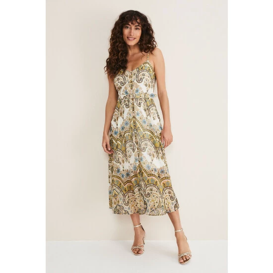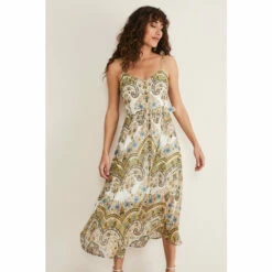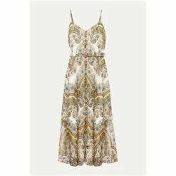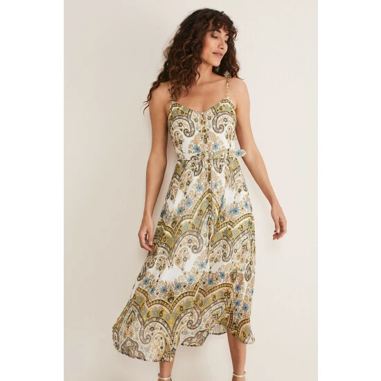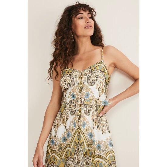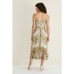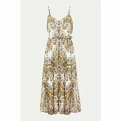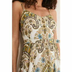 Be prepared to answer where you got this stunning dress from. Our new statement print is designed with vintage allure and our dress features feminine spaghetti straps and comes with a belt. Style with metallic shoes and matching accessories.