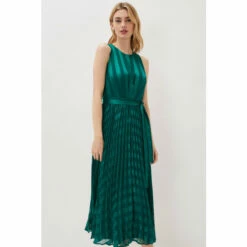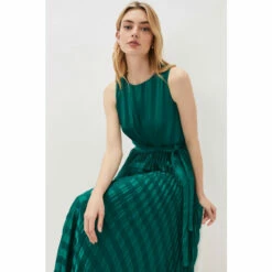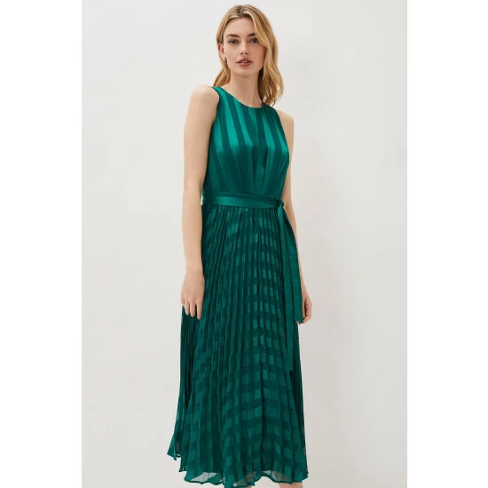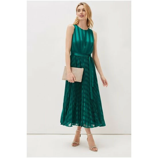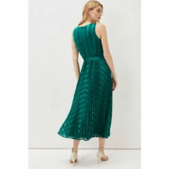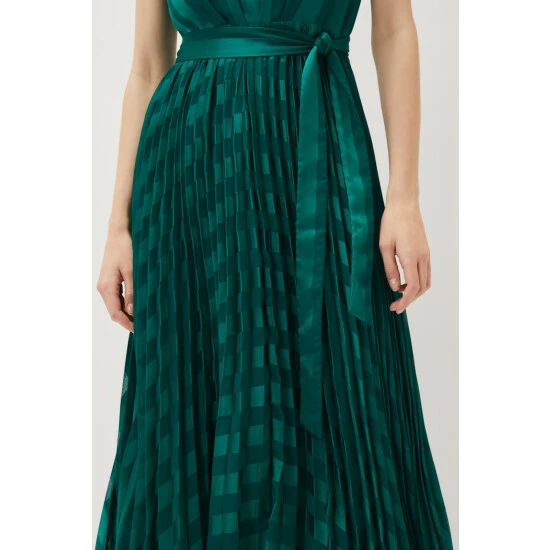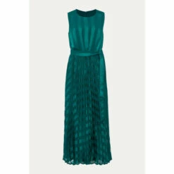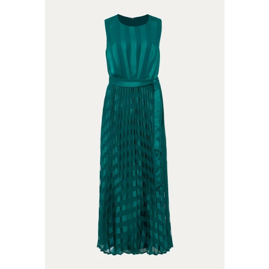 Make a statement with Phase Eight stunning Beverley dress that will be sure to wow at all of your upcoming occasions. With a striped design in a deep jade shade, this dress features a self-tie belt to accentuate your waist and comes to a pleated, midi-to-maxi length skirt. Style it with heels and a clutch for all your upcoming RSVPs. This beverly dress is a part of Phase Eight’s sustainably sourced collection. This style has been made from recycled polyester, giving materials that would have ended up in landfill a new lease of life.