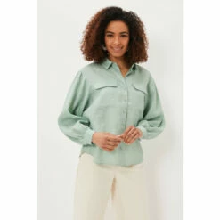 A must-have for your spring/summer wardrobe. Cut from airy, 100% linen and designed in a sage shade, our shirt features blouson sleeves and utility pockets. We wear this with ecru jeans for a warm weather look. A gorgeous top for your spring/summer wardrobe. Designed in a dusty pink shade and cut from airy, 100% linen, our blouse features a V-neckline and contrast buttons with tie details. We’ll be wearing this with the matching Raven linen trousers for co-ord style.