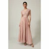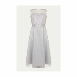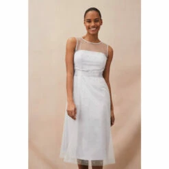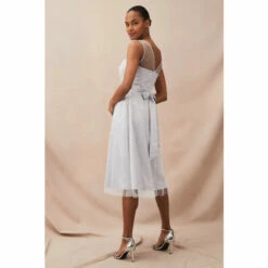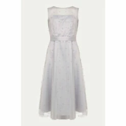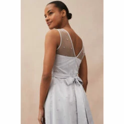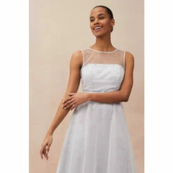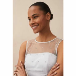 Crafted in a sleeveless silhouette, Evadine is delicately decorated with hand-placed pearl beads, an embellished detachable satin tie belt to accentuate the waist, followed by a voluminous tulle skirt that creates enchanting movement as you walk. The bandeau bodice is framed by a mesh panel and is softly boned to give a flattering fit.