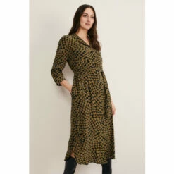 A new style for us that’s the perfect day-to-night piece. Our khaki Kesia dress is designed with contrast coloured love hearts to a flattering shirt dress silhouette with a self-tie waist belt. We wear ours with knee high boots for the perfect desk-to-dinner look. This style is responsibly sourced. This style has been made from certified renewable wood sources. LENZING™ ECOVERO™ viscose uses a responsible production process, generating up to 50% lower emissions and water impact than generic viscose.