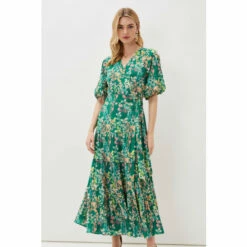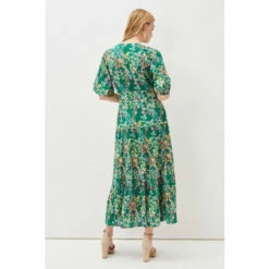 The perfect floral dress for all your upcoming events. Designed in a stunning green shade, this wrap maxi dress features elasticated cuffs that create an on-trend puff sleeve, and a loose silhouette that flows to a tiered skirt. Phase Eight wear theirs with matching heels and a clutch for perfect wedding guest style. Part of their Sustainably Sourced Collection. This style has been made from recycled polyester, giving materials that would have ended up in landfill a new lease of life.